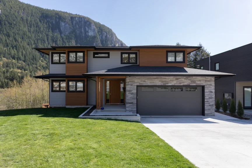 Welcomed by a cultured stone wrap feature wall at the entrance, this stunning custom west coast modern craftsman home opens up into the living area with a double sided fireplace that draws you to one of two private decks with unobstructed mountain views. Although it is located in a subdivision, through every strategically positioned window in the home is views of privacy and greenery. Move seamlessly throughout your living space with minimally vaulted central ceiling, various dining areas, office or guest room with bathroom, and wet bar, until you move up the open stairs and into an enclosed loft servicing all the bedrooms. The master suite opens to the other private deck and spa-like ensuite. In the basement you have a rec. room on one side and a privately accessed 1 bedroom suite on the other.